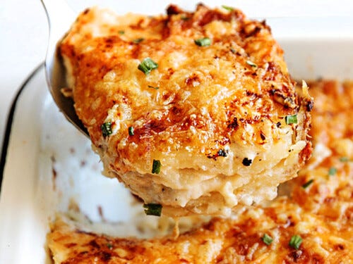When I was a kid, these potatoes were a no. Not the hard no that closes a conversation. More the kind you say while already reaching for a second helping, because really—cheese and potatoes are the original bad idea you can’t quit.