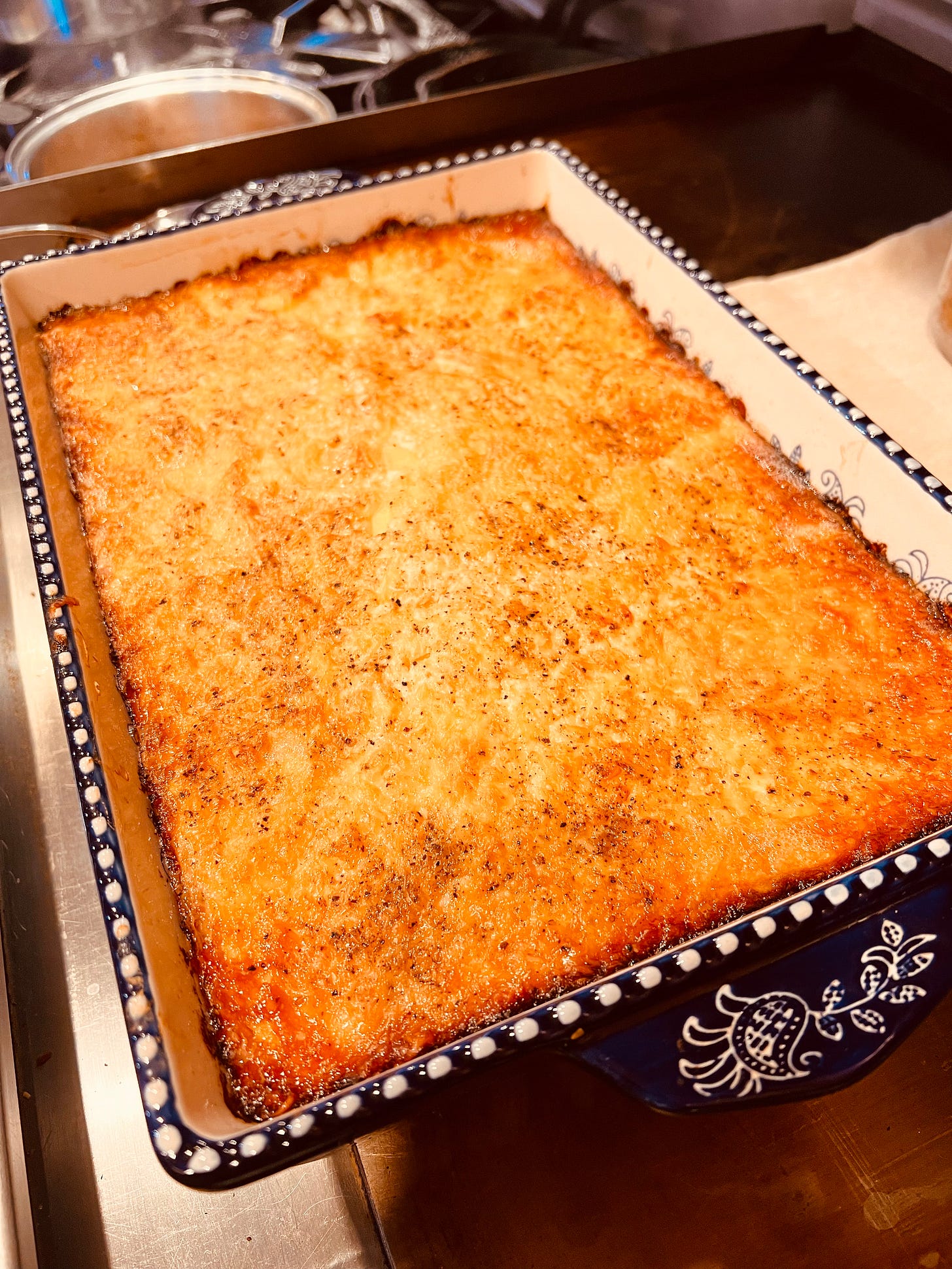 Serve them in the old transferware dish, the one with the blue flowers and the glued crack in the handle. Pyrex tastes like compromise. The transferware makes it look like we come from better people. When it’s ready, I scoop out the first portion and watch the clean edge it leaves behind. It’s strangely satisfying — a little geometry, a little grace. The potatoes slide onto the plate in slow motion, the top layers holding themselves together.